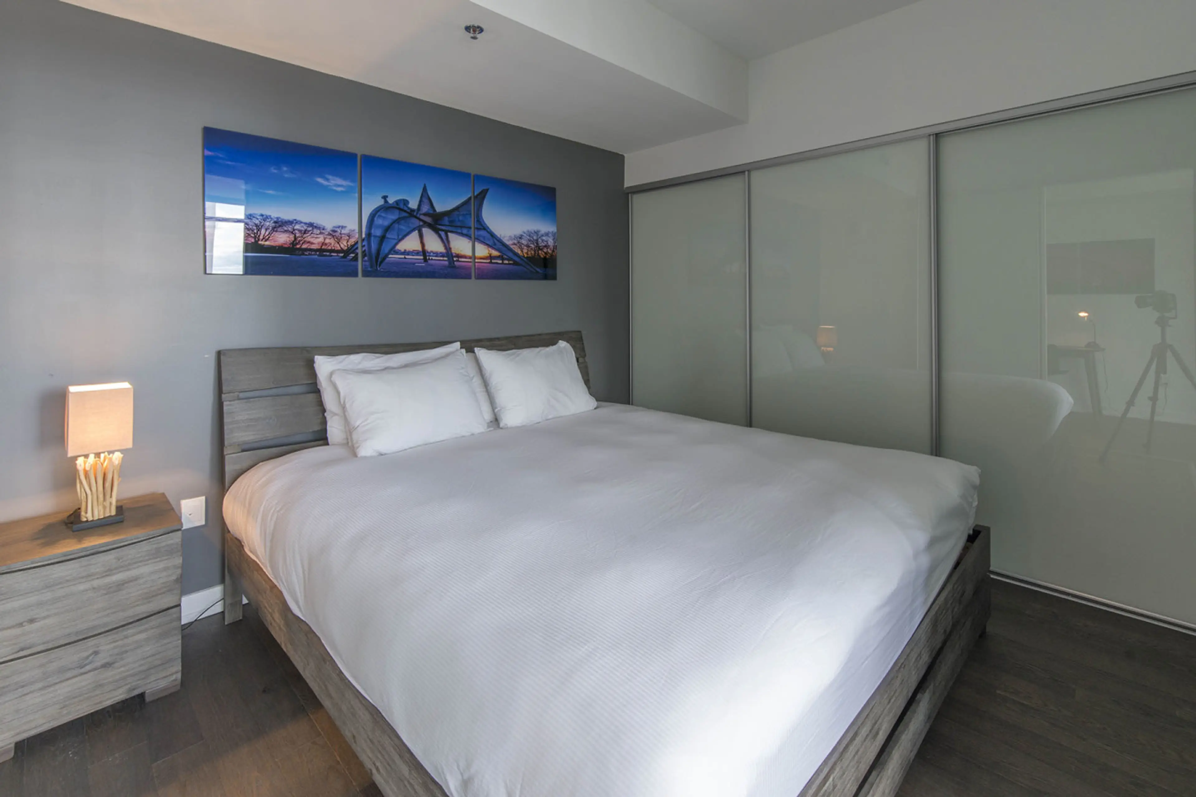 Indulge in a luxurious 1-bedroom retreat, perfect for business trips, family getaways, or romantic escapes. This chic apartment harmoniously blends comfort and elegance, ensuring an unforgettable stay. - Spacious bedroom with a plush Queen bed - Private laundry room equipped with a full-sized wash...